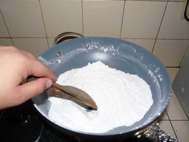 Poner la maicena o harina de arroz en un pan seco y asado durante unos 10 minutos en un bajo a medio de la llama así es marrón no. Luego dejó de lado para enfriar a lo largo de lado los discos.