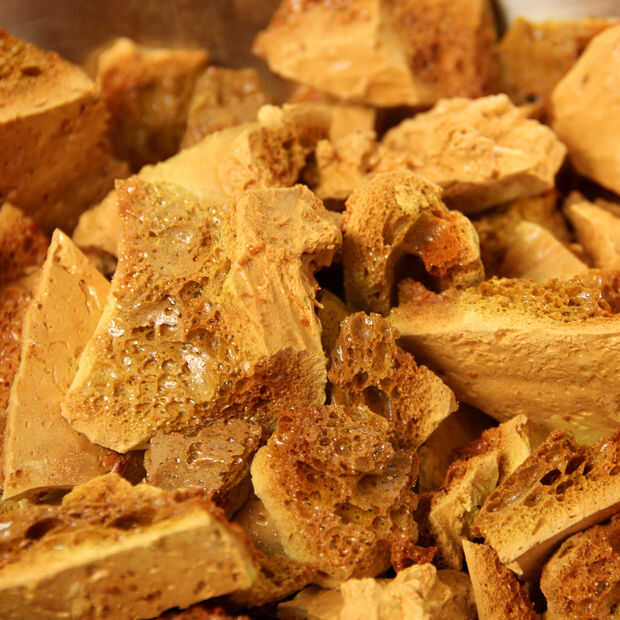 Este dulce es realmente el producto de una reacción acido-base como su proyecto de volcán de la escuela primaria. El bicarbonato de sodio y el ácido de la miel y el azúcar causan la mezcla azucarada se propagan y crear todos esos rincones deliciosos poco y recovecos que dan del panal su textura única.