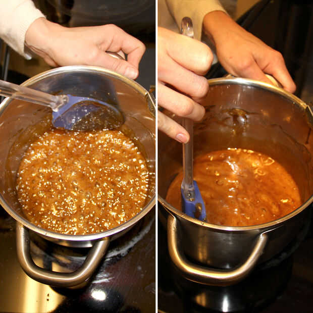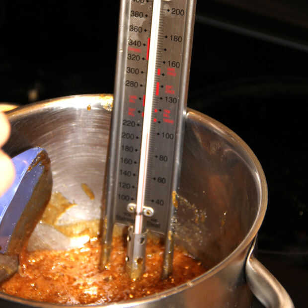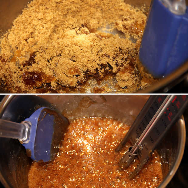Combinar la miel y el azúcar con un par de cucharada de agua en una cacerola grande (se va a expandir mucho!) y Cuécelo a fuego medio y cocine hasta que se llega a 300F (150C), revolviendo ocasionalmente y muy suavemente y pasando por los lados con una espátula de goma.