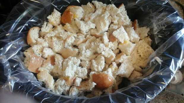 En un tazón grande bate junto los huevos, la mitad y mitad (o sustituto), azúcar, vainilla, nuez moscada y canela. Luego Vierta la mezcla sobre tu pan en la olla de cocción lenta. A continuación tome una cucharada y presione suavemente sobre todo el pan para asegurarse de que la cazuela toda se humedece.