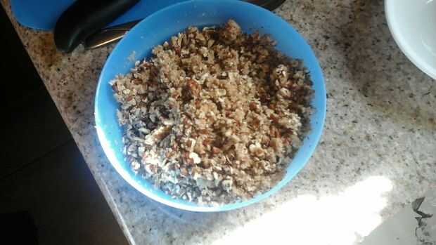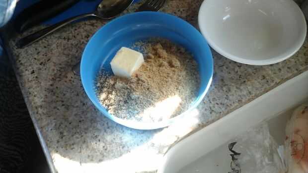 En un tazón mediano, use un cortador de pastelería (o tenedor) para cortar la mantequilla el azúcar marrón embalado hasta piezas ~ tamaño de guisante. Luego agregue las nueces gruesamente cortadas. A continuación, vierta la mezcla sobre el pan humedecido.