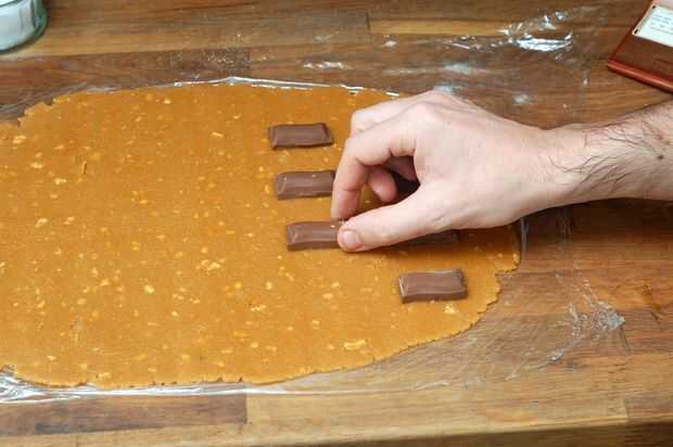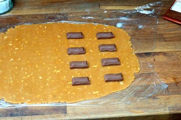 Añadir los trozos de caramelo cubierto de chocolate a una mitad de la masa, espaciados uniformemente - cada uno forma el centro de una galleta.