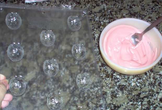 Usar la cuchara para extender la capa de caramelo dentro del molde, dejando un área hueco en el centro.