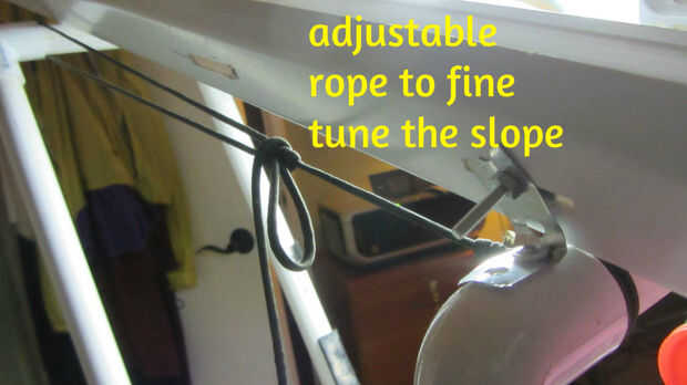 Con la canaleta en los soportes, mover el respaldo hacia adelante o hacia atrás para encontrar ese ángulo perfecto donde candy desliza suavemente el momento uno se coloca en el canal. Bloquear la posición de los soportes atando una cuerda desde la parte delantera a la parte posterior para que el respaldo se mantiene estable.