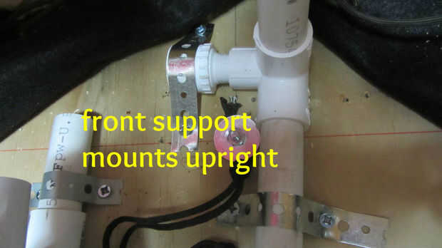 Crear un marco rectangular de PVC montada perpendicular a la plataforma y de 1" por encima de la cinta transportadora. Cómo más adelante la parte delantera de la manga del PVC marco de la depende de la pendiente. Para la estabilidad, en la parte inferior del rectángulo utilizar codos de 90 grados con salidas laterales y 3/4" a 1/2" reductores conectados a las salidas. Con correa de colgar, montar un reductor y la parte inferior la barra transversal.
