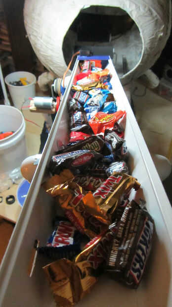 Finalmente colocó sobre el uso de un simple canal de plástico como un canal inclinado del caramelo. El dulce se coloca dentro del conducto. Una aleta en la parte delantera de la tolva se abre por un pequeño periodo de tiempo. Candy se desliza hacia fuera en la correa y se entrega al niño. El sistema de conducto es realmente barato en comparación con las otras ideas. No sé a ciencia cierta lo que el tipo de caramelo exacta y tamaño será hasta unos días antes del evento. He tratado de construir en la capacidad de variar el comportamiento del sistema (pendiente y anchura de la tolva, la duración de la abertura de la aleta) en caso de que el caramelo es un poco más grande o más pequeño de lo previsto.