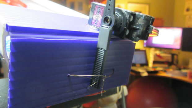 Cortar un trozo rectangular de Cororplast (o tablero de la espuma) donde el ancho es el ancho del canal y la altura es 4". Marcar una línea horizontal de 1 3/4" del extremo. Corte solamente hasta la mitad en el material para crear una aleta. Con la tapa de la canaleta y cerrado, no debe tocar el cinturón. Colocar un servo en la aleta que su brazo puede abrir y cerrar la tapa. Utilice alambre o cinta en el brazo del servo para que pueda abrir la puerta. Extienda el brazo del servo si es necesario.