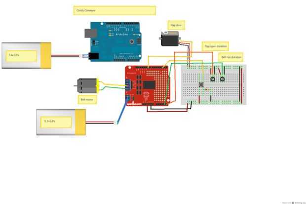 Los cambios a este circuito consistió en agregar un servo para el control de la aleta, dos potenciómetros de ajuste para ajustar la duración de la banda corriendo y la solapa de apertura, y reemplazando el SparkFun Ardumoto con el escudo de AdaFruit Motor v 2.0 de modo que puede ser poder separada dos fuentes (una para el motor de la C.C.) y otro para el controlador y el servo. También fue una entrada analógica para un photointerrupter. Esto es como el módulo previo señales el monstruo para empezar el cinturón y abrir la tapa para liberar el caramelo.