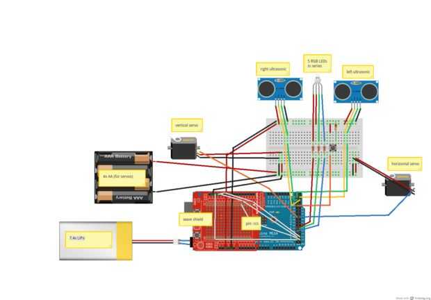 Los cambios aquí son bastante extensos. Como quería el sonido, he añadido un protector de la onda de Adafruit. Esto requirió un microcontrolador más grande, el Mega 2560. Pines de los servos, LEDs y ultrasonidos movidos. Debido a los conflictos del temporizador, se utiliza una biblioteca de diferentes servo.