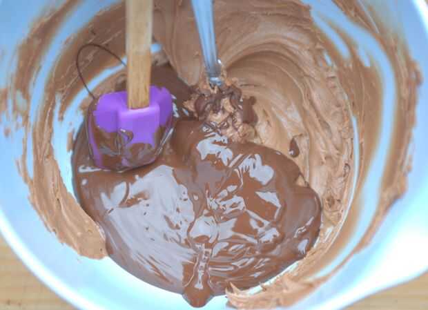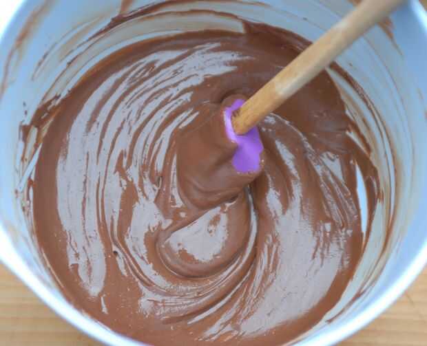 Derretir el chocolate negro al baño María y deje que se enfríe un poco. Todavía debe ser viscoso pero no líquida