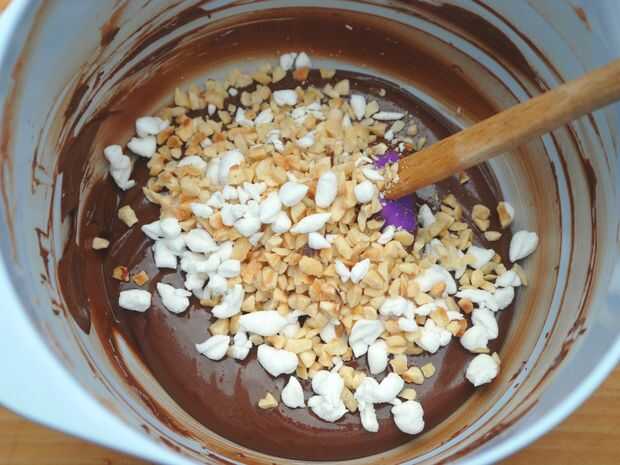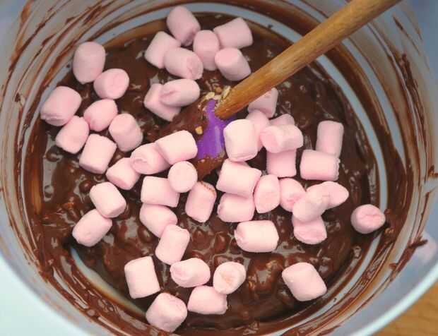 Añadir el chocolate derretido a la mezcla de sugarbutternutella y mezclar bien. Añadir las nueces y malvaviscos blancos y mezclar otra vez. Finalmente agregamos los malvaviscos rosa, incorporarlas pero no revolver demasiado salvajemente.