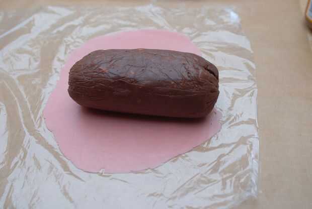 Colocar el mazapán entre dos pedazos de plástico y rodar hacia fuera. Quitar la envoltura plástica superior, coloque la salchicha en la hoja de mazapán. Envuelva la cubierta alrededor de la salchicha mientras que el segundo envoltorio plástico todavía se une. Recorte cualquier exceso mazapán en el lado y pellizcar el mazapán en el extremo para formar un bonito fin de salchicha. decorar el extremo con un cordel de cocina.