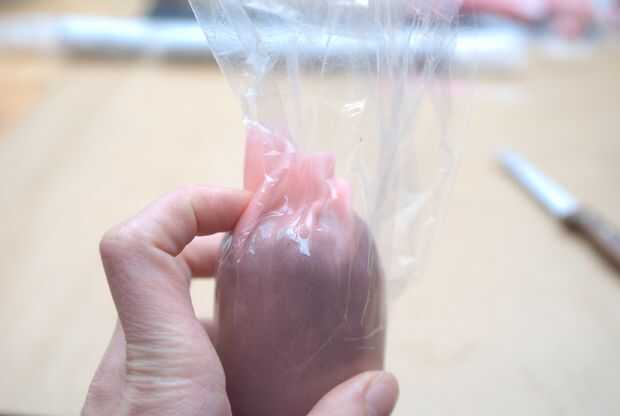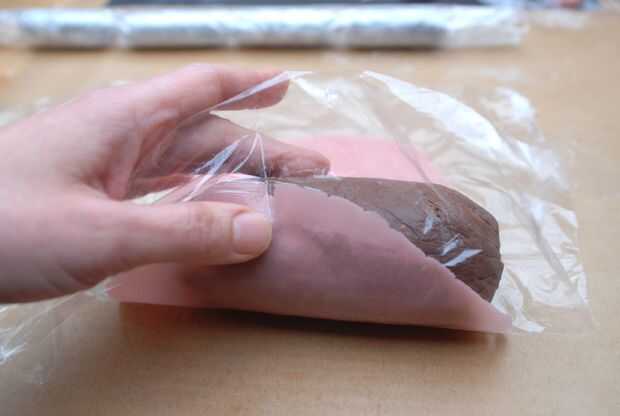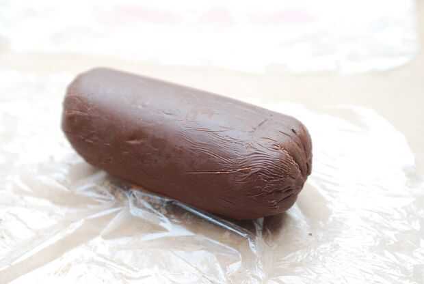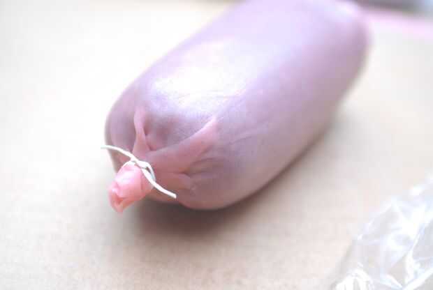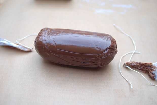 Cuando la salchicha había descansado durante varias horas en la nevera sacar y desenvolverlo. Cortar los extremos de la salchicha y quitar el film transparente.