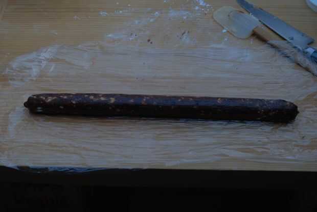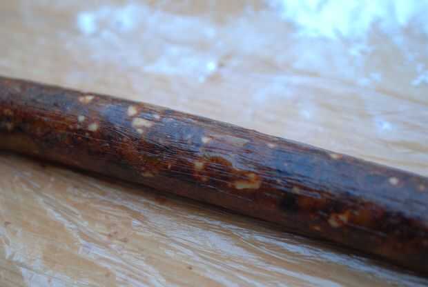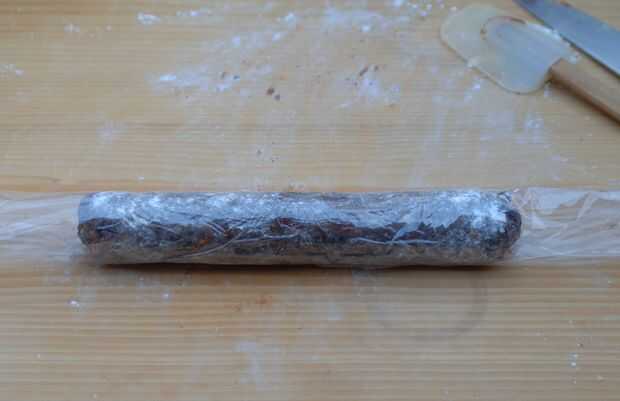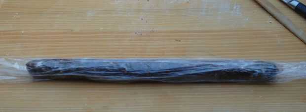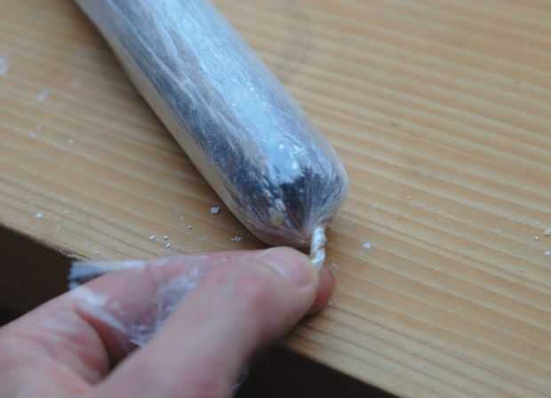 Envuelva el cilindro con una pieza de envoltura de plástico y rodillo hasta que alcance la forma deseada. Luego gire el envoltorio de plástico superpuesto a la forma los extremos de la salchicha. Desenvuelva el chorizo y deje que se seque durante la noche.