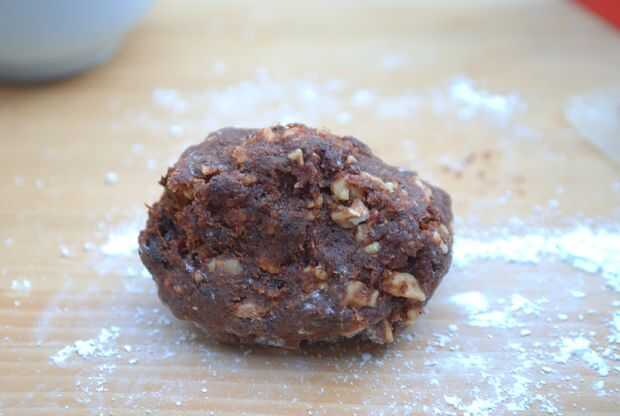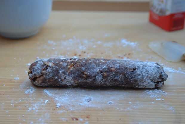 Polvo de la superficie de trabajo con azúcar en polvo y aproximadamente el rodillo la masa de fruta a una forma cilíndrica.