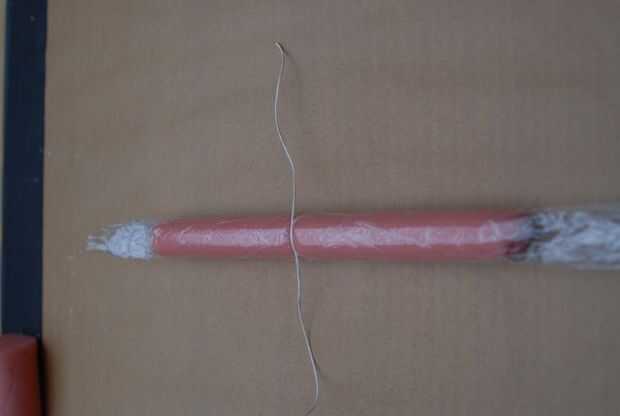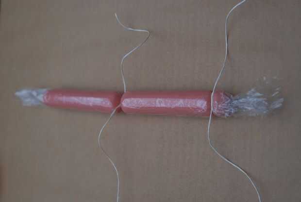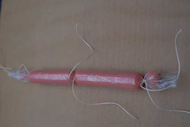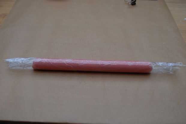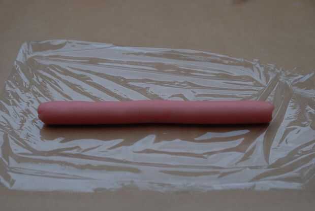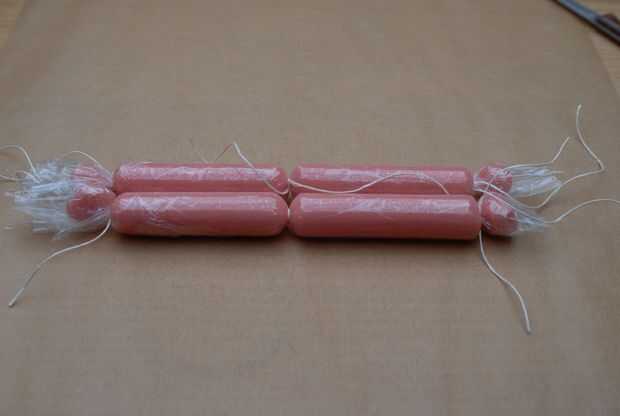 Primero el rodillo el mazapán a una forma cilíndrica larga. Envuelva ese cilindro en envoltura de plástico y constreñir a las partes de la longitud de salchichas con bramante de cocina.