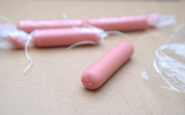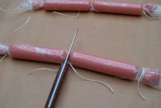 Cortar con un cuchillo afilado aunque las partes estranguladas y Desempaquete el wiener. Voila!