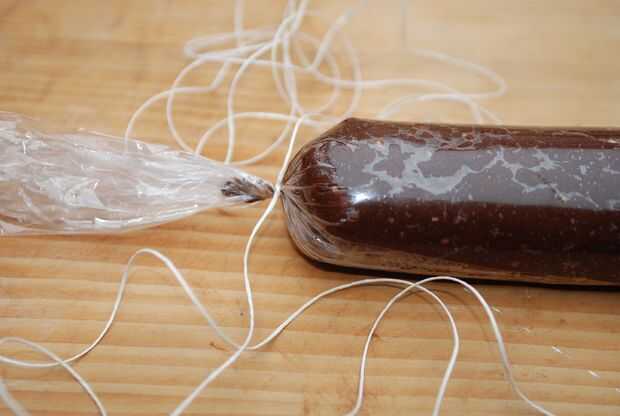 Si desea que sólo un salami simple puede saltar el siguiente paso de la decoración de la guita. Sólo Coloque la salchicha en el frigorífico y dejarlo enfriar y resto durante varias horas o durante la noche.