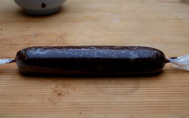 Asegúrese de que la mezcla de chocolate ya no es líquido, si no esperar un poco más de tiempo para dejarlo enfriar. (Cuando la mezcla es líquida es difícil empacarlo de abrigo) Pon un pice grande de plástico en su área de trabajo y la mezcla de chocolate nueces aproximadamente en una salchicha como forma en él. Doble la envoltura plástica y rodillo de la salchicha por lo que se cubre en el abrigo. Atar ambos extremos de la salchicha con hilo de cocina.