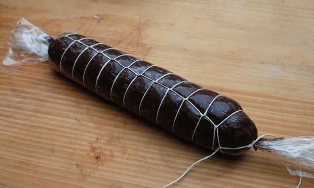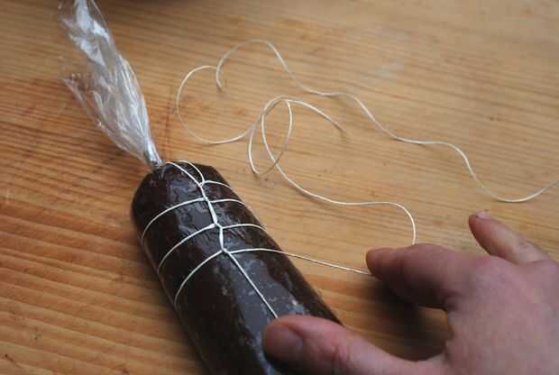 Si usted quiere su salami con unos cordeles de lujo debe colocar la cuerda mientras el chocolate está siendo shapeable. Utiliza dos filamentos largos de cocción guita, seguro en un extremo de la salchicha y enwind el salami. No haga nudos, sólo se entrelazan los dos stands cuando se cruzan entre sí - más tarde tendrás que sacar la guita para pelar el salami de la envoltura de palstic (y después de peeling tendrás que enrollar la cuerda hacia atrás otra vez).