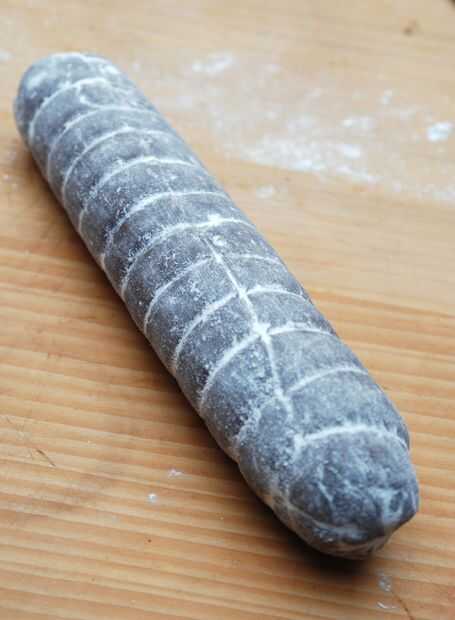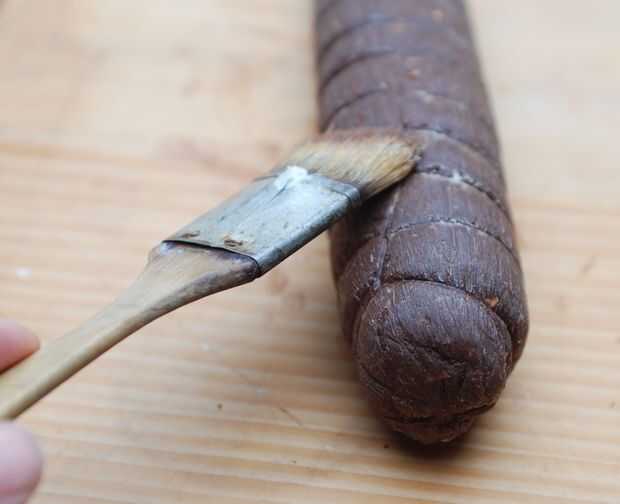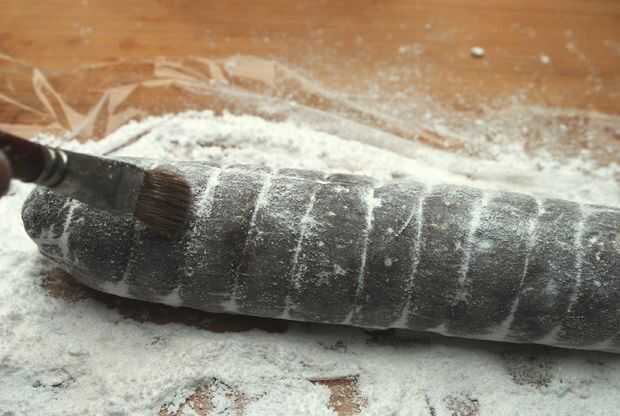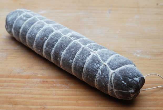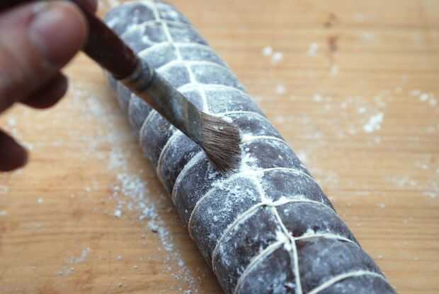 La salchicha con mantequilla suave del cepillo y luego cubrir toda la superficie con azúcar en polvo. Toque el Salame un poco o usar un cepillo seco para quitar el exceso de azúcar.