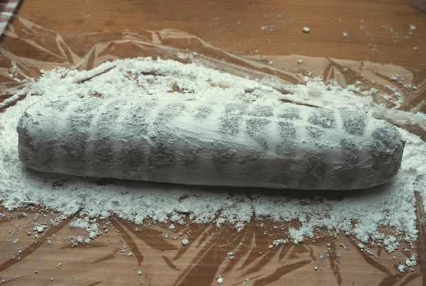 Si ha elegido la decoración de la guita ahora puede con cuidado agregar las hebras de hilo otra vez el mismo patrón. Te recomiendo usar guantes de vinilo de grado de alimentos para esta tarea, hace un poco más fácil no dañar la superficie de polvo de la salchicha. Yo no los usa y tuve que volver a polvo algunos puntos con azúcar en polvo.