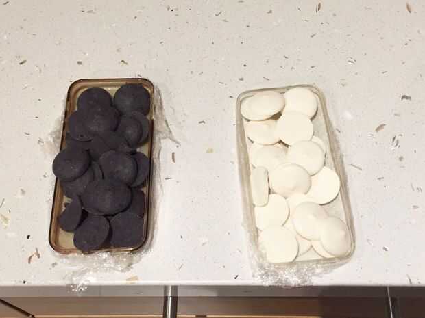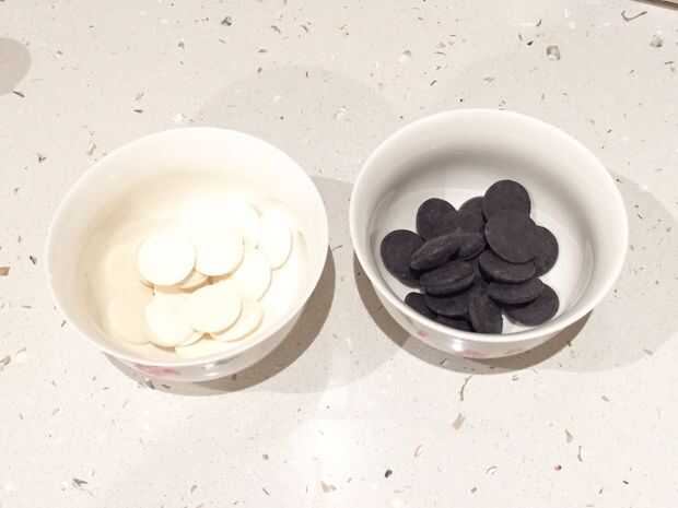 Para medir cuánto chocolate tendrás que derretir, colocar las obleas de derretimiento de caramelo en sus moldes y extienda para que llene aproximadamente para arriba. Coloque estos derretimientos de caramelo en un recipiente y microondas en alta en 30 intervalos de segundos hasta que el chocolate quede liso.