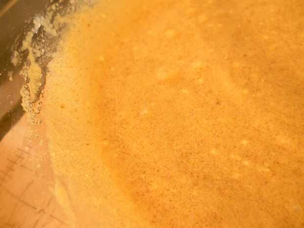 3. Lentamente la mezcla de mantequilla derretida, luego agregar la crema de leche y la vainilla