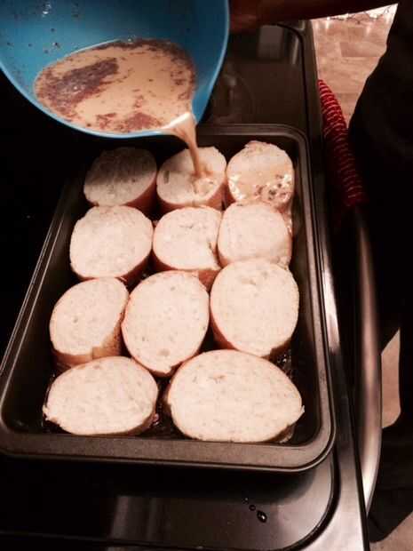 3. Vierta la mezcla de huevo uniformemente sobre las rebanadas de pan. La mezcla debe cubrir cada rebanada de pan.