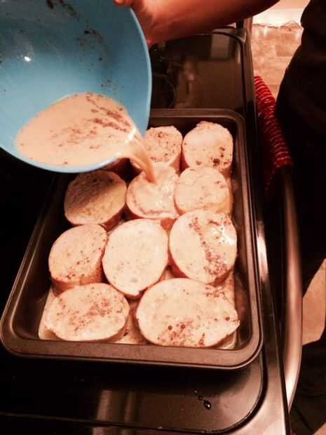 1. Mezcle los huevos batidos, leche, vainilla, sal y canela en un tazón.