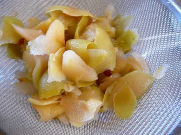 Retirar del fuego, colar el jugo, desechar las cáscaras y reservar.