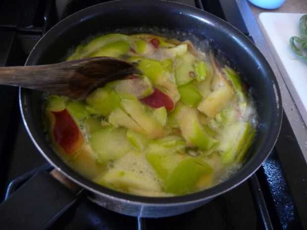 Pelar, base y cortar las manzanas, reservando la piel y corazones.