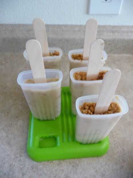 El relleno de manzana debe ser un montón lo suficientemente grueso como para sostener los palitos verticales, pues les Inserte 2/3 de la manera abajo en la paleta y congelar por al menos 6 horas.