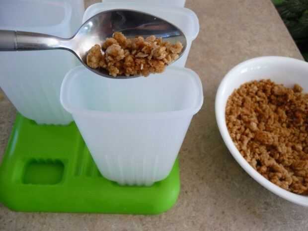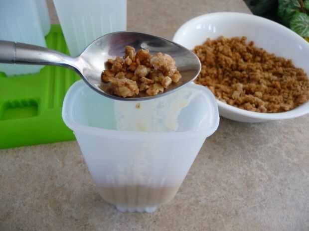 Llenar el molde hasta que la mezcla de manzana es aproximadamente 1/2" de la llanta. Terminar con otra 1/2 cucharadita de nuggets de avena y localice los palitos.