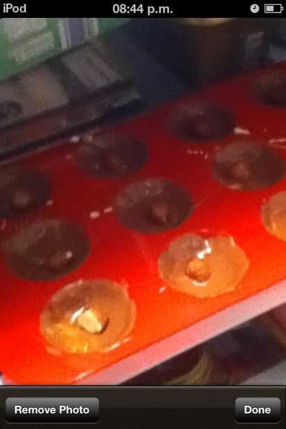 Lavar el bote del blanco chocolate o utilizar un recipiente diferente. Con la capa de chocolate con leche debe fundirse en la misma forma que antes pero luego cuando viertes debe obtener un pincel de repostería y refrescar el chocolate de los lados del molde. No importa si los dos chocolates mezclan un poco se ve un poco fresco de esa manera. Entonces si va a agregar las tuercas ahora se le cae uno en el centro de cada segmento. Refrigere nuevamente. GUARDAR CUALQUIER SOBRA LECHE CHOCOLATE!