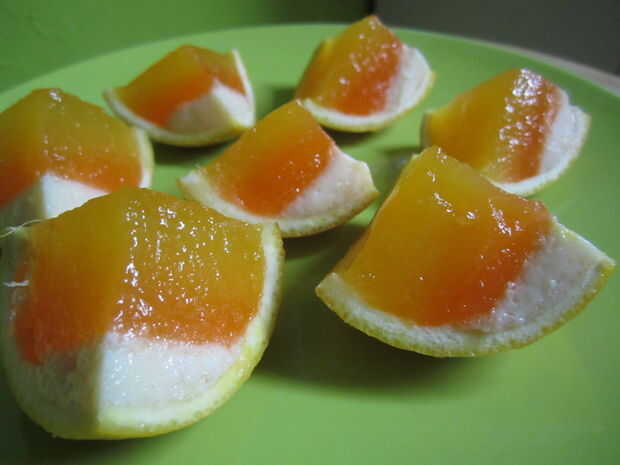 Puede utilizar cajas pequeñas o grandes de gelatina según la cantidad que desee hacer. Lleno de 11 naranjas utilizando cajas de 3oz, pero obviamente va a depender del tamaño de sus naranjas.