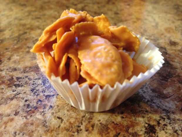 Combinan bocados y mantequilla de maní en una olla grande hasta que se derritan.