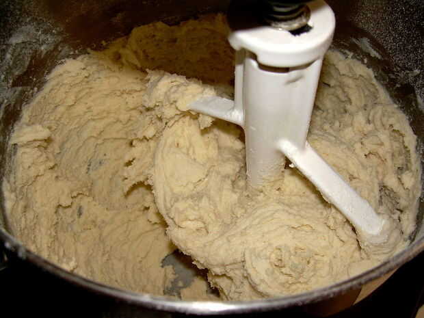 Añada lentamente los ingredientes secos en la base húmeda, revolviendo a medida que avanza. Asegúrese de que obtener todos los ingredientes secos muy bien incorporados. La masa debe ser un poco pegajosa, pero seque suficiente para manejar. Dejar reposar un minuto permitir que la harina absorber más de líquido antes de manejar si usted tiene gusto.
