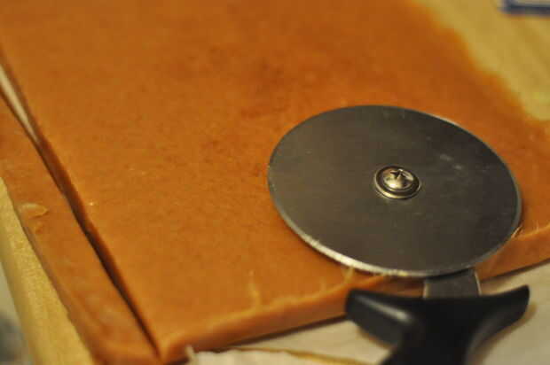 Envuelva el papel de cera alrededor de los pedazos individuales y tuerza o doble los extremos alrededor de él para mantener fresco el caramelo. Puede ser laborioso corte y envoltura docenas de caramelos, por lo que usted siempre puede envolver grandes losas en hojas grandes de papel de cera.
