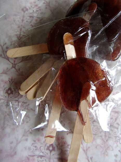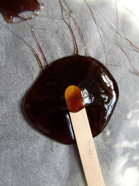 Una vez a temperatura Retire la cacerola del fuego y sumergir la parte inferior de la taza de agua fría durante un par de segundos para evitar que más de calefacción. Mezclar en el alimento colorante si la está usando. Sacar la bandeja del congelador, lo dejó fuera al revés (el aire por debajo con enfriar el caramelo más rápido) y la línea con el pergamino. Cuchara de pequeñas manchas de caramelo en el pergamino. Coloque un palo de piruleta en cada uno y selle con otra gota de caramelo.