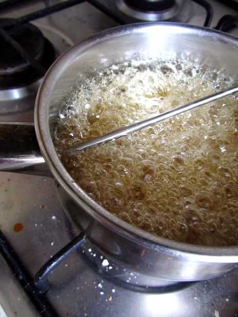 (Este método de caramelo utiliza un termómetro de azúcar para encontrar crack duro temperatura. Esta es la etapa en que se haya evaporado casi toda el agua del jarabe de azúcar y el caramelo se pondrá duro como un dulce hervido. Si no tienes termómetro puede utilizar la prueba de la agua fría, una buena explicación de que se puede encontrar aquí.