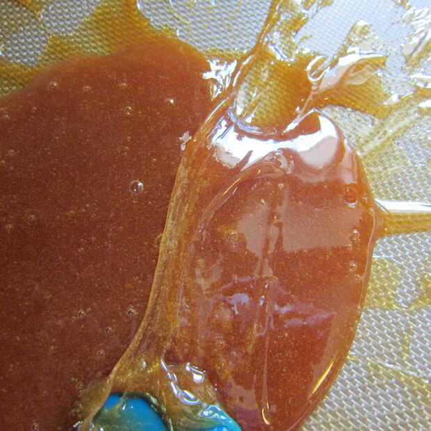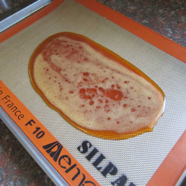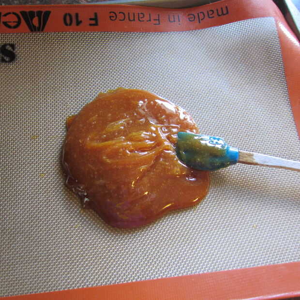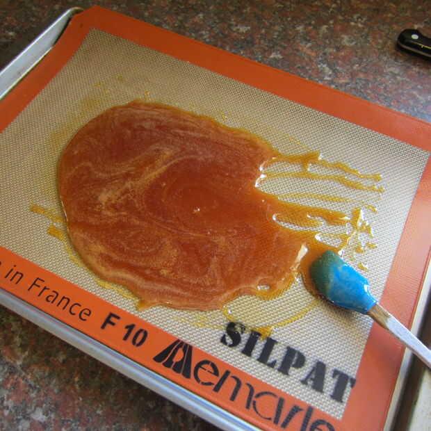 Una vez la miel alcance la temperatura físico-matemáticas, viértala en una bandeja, cubierta con algo no adhesivo. Con una espátula, tal y amasa la miel para ayudarla enfriar. Dentro de poco, empezará a pegarse a sí misma y dejará de pegarse a la espátula. Esto me llevó 5-10 minutos, sé paciente. En su momento la miel se convertirá en una pila calentita.