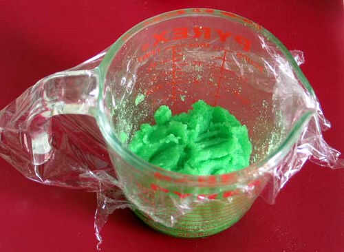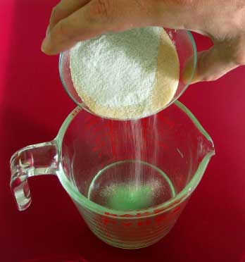 Se pondrá muy espesa mientras se trabaja en los polvos. A veces, terminó como un trozo de arcilla. Añadir solo un poquito más de agua a la mezcla para obtener una consistencia fangosa. De cualquier manera funciona bien. Rebañe las paredes de la taza de medición y tratar de bajar la gelatina en contacto con el material húmedo.