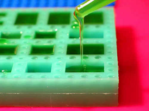 Mayoría de las veces cuando se hacen gomitas no intentará moldear en 360 grados. La parte superior (que será la parte inferior de los caramelos) sólo queda plana. Quería moldear en pequeños agujeros en la parte inferior de en mis ladrillos por lo que en realidad podría apilarlas.