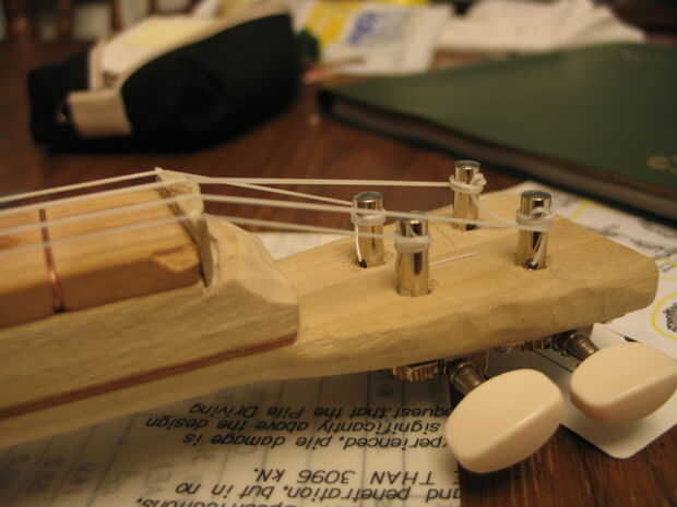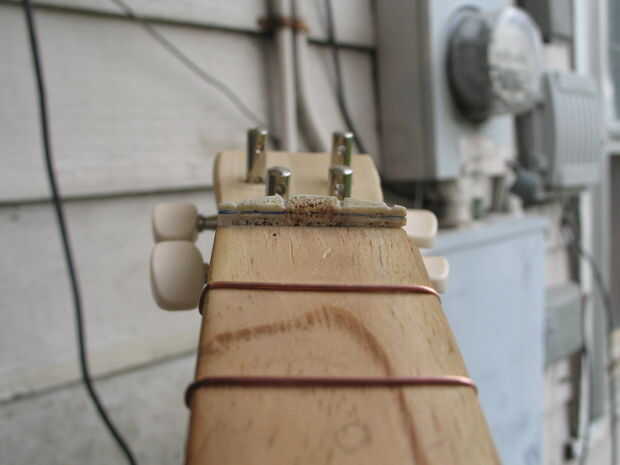 Esta es otra razón para hacer un nuevo puente. Presentar las ranuras de la tuerca y la silla de montar para aceptar las cuerdas y mantenerlas de deslizamiento hacia adelante y hacia atrás. Tuve un comienzo falso en la ranura de la silla de montar para la G de la secuencia que le permite saltar hacia los lados cuando pulsaba demasiado vigorosamente.