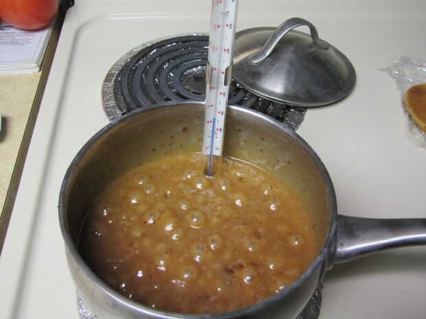 Coloque el termómetro de caramelo en el caramelo y cocinar a la temperatura deseada, revolviendo con frecuencia.