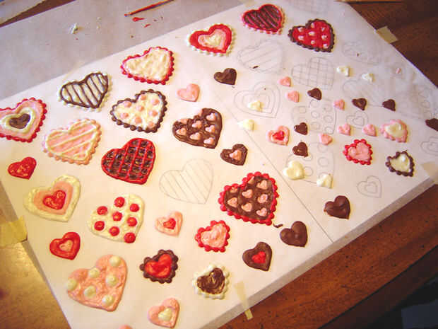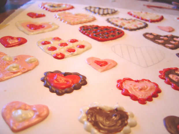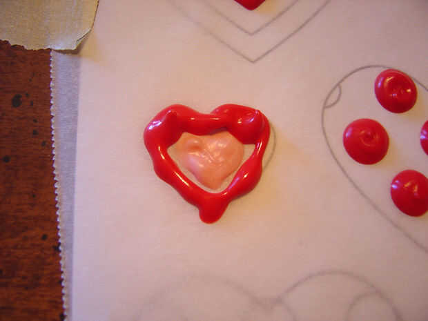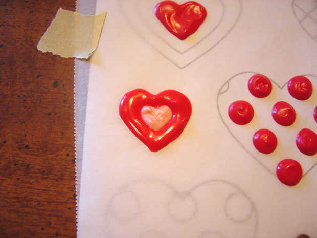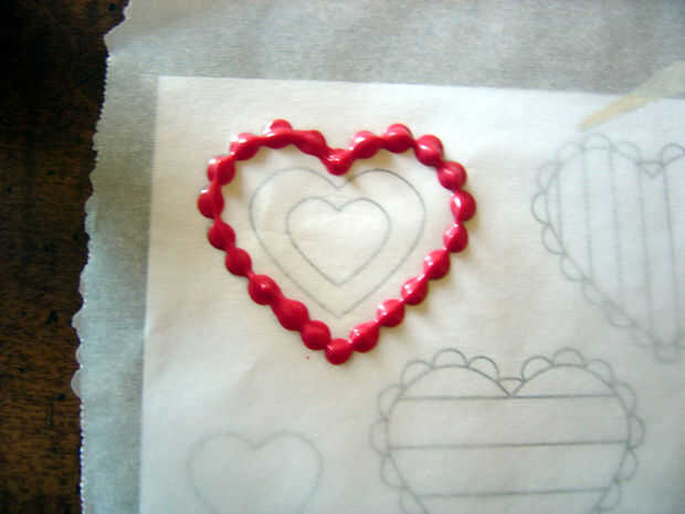 Corazón de lunares/polka, centro corazón de formas de 'target' - do estos segundo. Para lunares es como el borde de encaje - sólo exprimir más caramelo y poner en el centro del círculo. Para corazones dos puntos - las dos principales partes del corazón - entonces utiliza su palillo para arrastrar el caramelo hacia fuera al borde de la escucha forma.