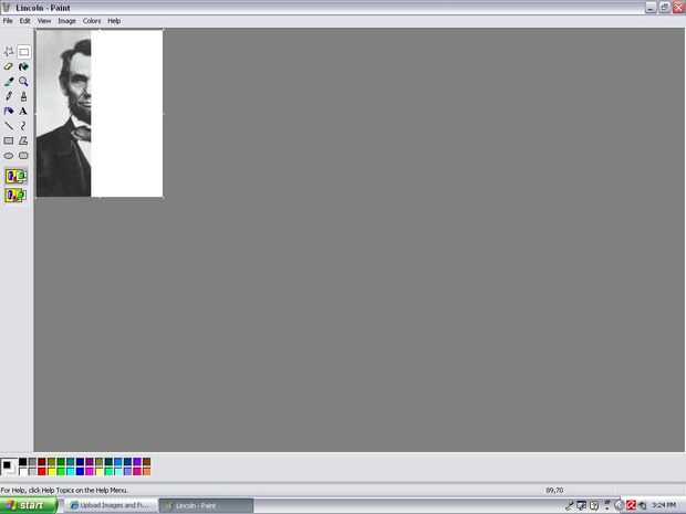 Así que tome la mitad de la imagen con la selección del rectángulo. Obtener el lado izquierdo del rectángulo de selección alrededor de la mitad de la nariz. Haga clic derecho y asegúrese de que tener "Flip horizontal" comprobado. Bien del golpe y arrastre que la mitad de la imagen sobre el lado de su cara izquierda de la derecha de la imagen, dejando una mitad en blanco y la otra mitad con lo que solía ser Lincoln. Ahora golpe shift + click izquierdo. La imagen de abajo es lo que usted debe terminar con.