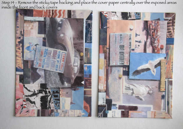 Recortar la imagen hacia fuera hacia fuera, cubierta la espalda con cinta adhesiva de doble cara, retire el respaldo y colocar sobre el área expuesta dentro de la cubierta frontal. Presionar bien con el rodillo. Su portada está ahora completa. Repita todo el proceso para crear la cubierta posterior.