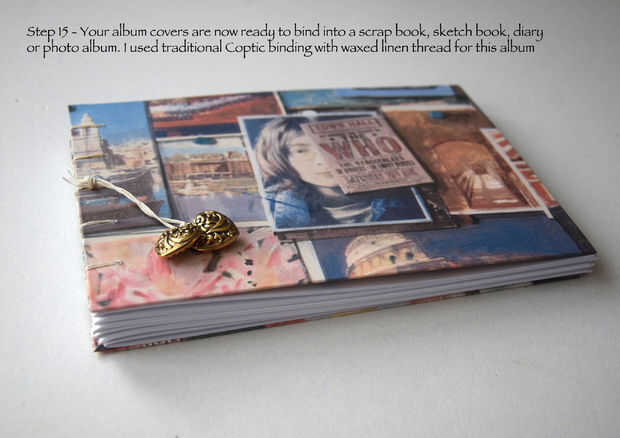 Tu álbum está listo para unir en cualquier tipo de álbum que desea crear. Yo he hecho es un libro del bosquejo. El papel que utiliza para esto es una alta calidad Fabriano y podría ser utilizado como un álbum de fotos, libro de chatarra o diario. La manera he enlazado el álbum significa que se abre completamente para facilitar su uso al esbozar. También he añadido algunos corazones oro en hilo encerado alineada a acabar. Para obtener más información en enlace o donde conseguir el papel que utilizan, visita mi blog en www.anythingexcepthousework.co.uk .